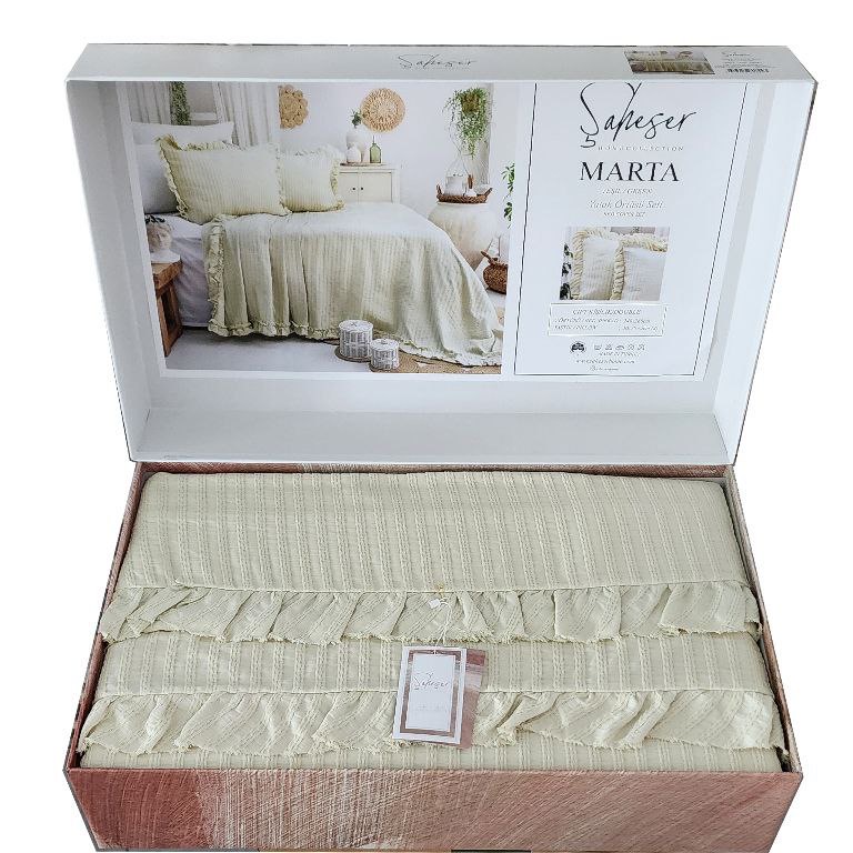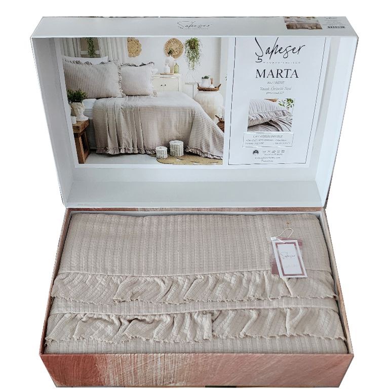 ما در تولید مدل Marta از متریال ممتاز و دوخت تخصصی بهره بردهایم تا این ست، علاوه بر ظاهر چشمنواز، دوام، نرمی و ماندگاری بالایی داشته باشد. همین کیفیت بالا سبب میشود پس از شستوشو، فرم و طراوت روتختی و روبالشتیها حفظ شود. رنگبندی متنوع Marta باعث شده تا بتوانید مطابق با سلیقه یا دکور، مدل دلخواه خود را انتخاب کنید و هر روز از حس تازگی و آرامش در اتاق خواب خود لذت ببرید.