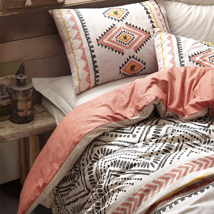 مدل Ethnic با نقش‌های هندسی یا الهام‌گرفته از طرح‌های بومی، حال‌وهوای متفاوتی ایجاد می‌کند. این طراحی با رنگ‌های طبیعی و گرم، هماهنگ با دکوراسیون روستیک، کلاسیک سنتی یا حتی بوهمین، نمایی خاص به فضای اتاق خواب می‌دهد و آن را از حالت یکنواخت خارج می‌کند.