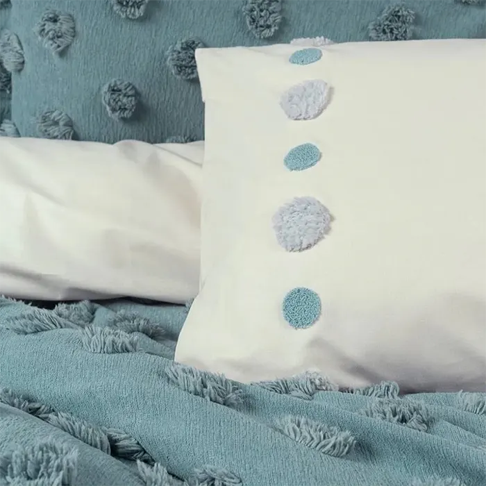 رنگ زیبای سبز نعناعی (Mint) همراه با طرحهای ظریف، فضایی آرام و دلنشین در اتاقخواب ایجاد میکند. این رنگ، حس طراوت و تازگی را تداعی کرده و بهسادگی با انواع دکوراسیون مدرن یا کلاسیک هماهنگ میشود. حاشیهدوزی دقیق روبالشیها و هماهنگی کامل بین بخش روتختی و کاور، جلوهای لوکس و یکدست به تخت میبخشد.