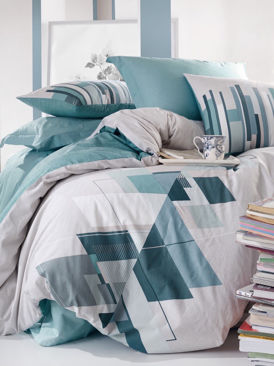 سرویس ۴ تکه کتان باکس دو نفره مدل Mode Line | ترکیب خاص آبی و طوسی